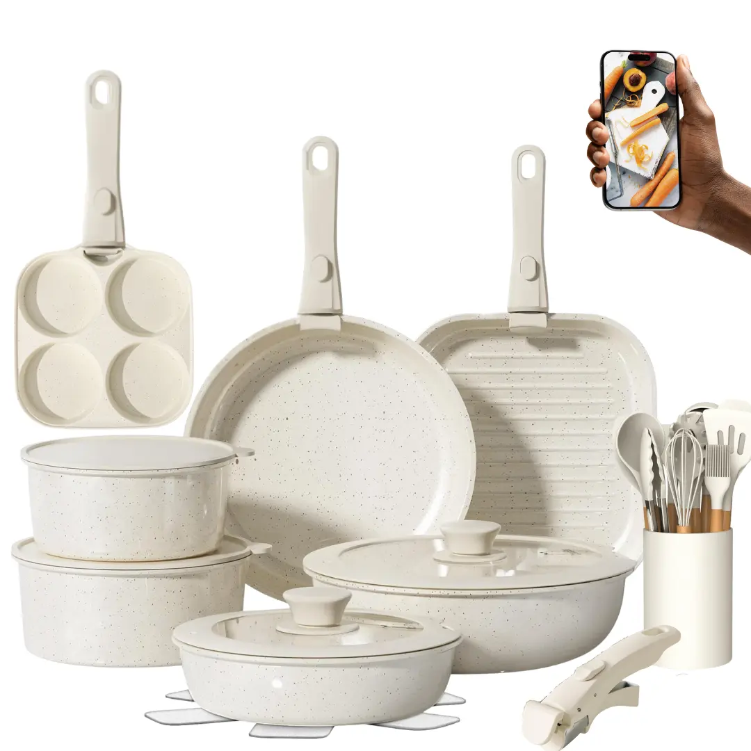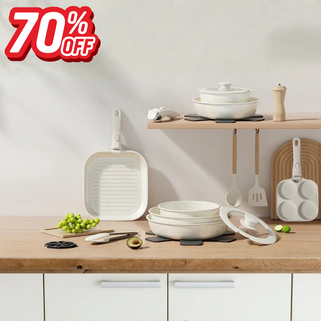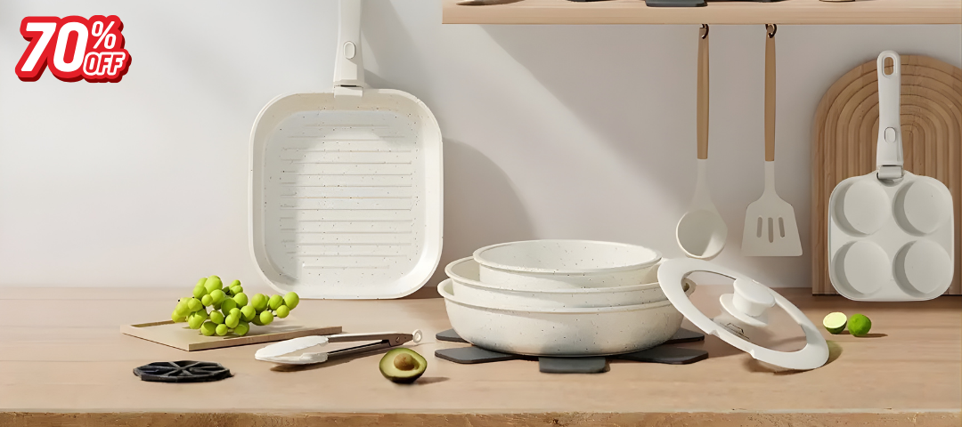 This isn’t a typical discount. It’s a rare price drop on a bundle designed to replace your entire cookware setup — detachable ceramic pieces, grill pan, breakfast pan, utensils, storage lids, pan protectors, and more.